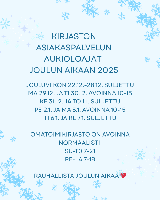 Kirjaston asiakaspalvelu on suljettu jouluviikon 22.-28. joulukuuta.