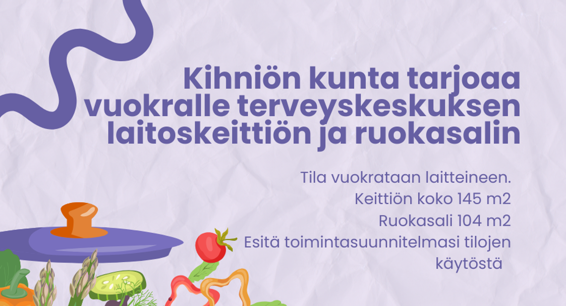 Tila vuokrataan laitteineen. Keittiön koko on 145 m2 ja ruokasali 104 m2. Vuokraus edellyttää toimintasuunnitelmaa tilojen käytöstä.