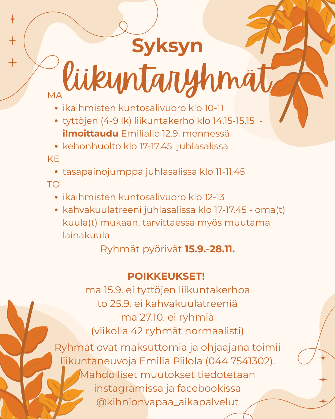 Kunnan vapaa-aikapalvelut tarjoavat yleisiä uimavuoroja kuntalaisille terveyskeskuksen altaalla sekä liikuntaneuvojan ohjaamia maksuttomia ryhmiä. Ryhmistä ajankohtaisen tiedon löydät liitteistä sekä Instagramista ja Facebookista @kihnionvapaa-aikapalvelut. Syksyn 2025 ryhmät alkavat syyskuussa ja niistä lisätietoa liitteissä.